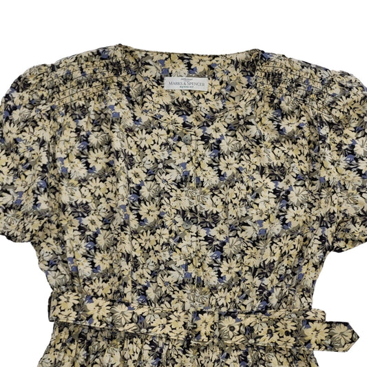 90s Vintage M&S Beige & Blue Floral Daywear Dress Women's Size 10/12