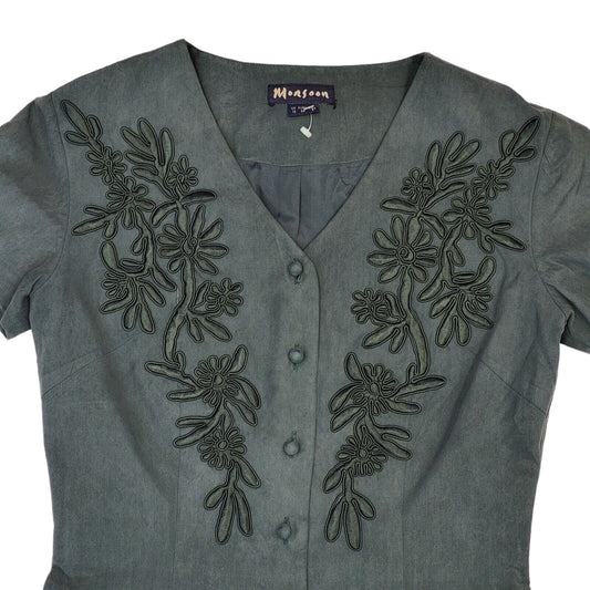 90s Vintage Monsoon Dark Green Silk Buttoned Daywear Dress Women's Size 10