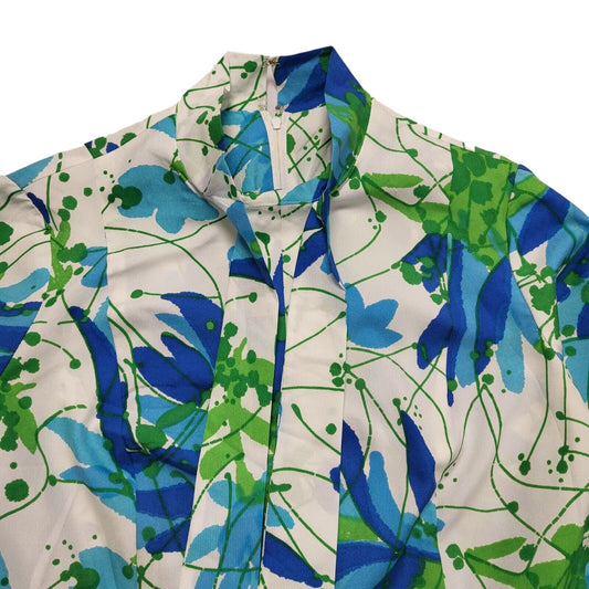 70s Vintage Blue White Green Neck Bow Long Sleeve Fit & Flare Dress Women's 12