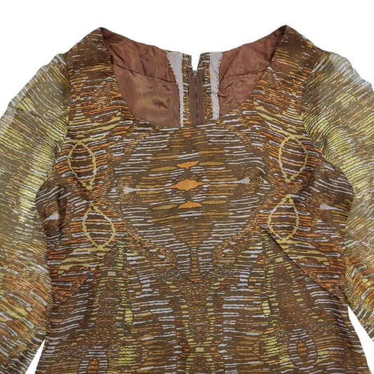 70s Vintage Brown Abstract Patterned Long Sleeved Maxi Dress Women's 10