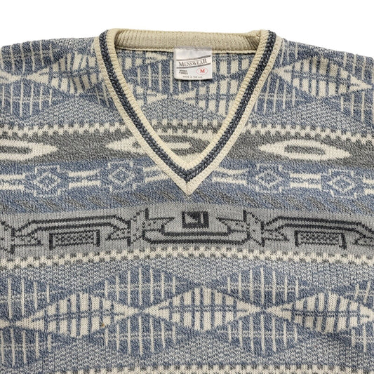 Menswear Vintage 80's Blue & White V-Neck Jumper Mens UK M