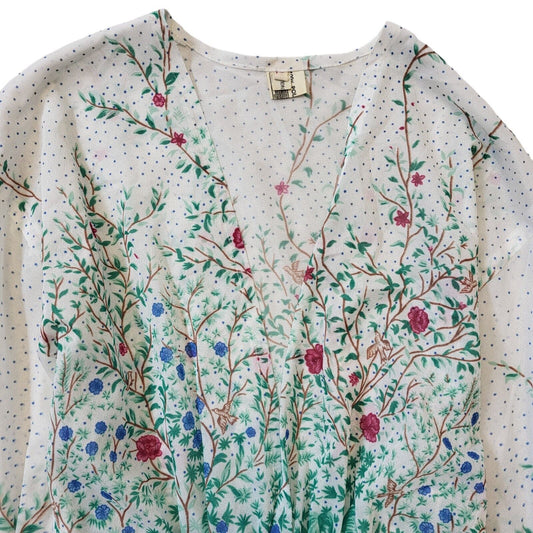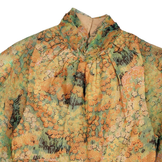 70s Vintage White Green Floral Blouse Long Sleeve Women's UK 12