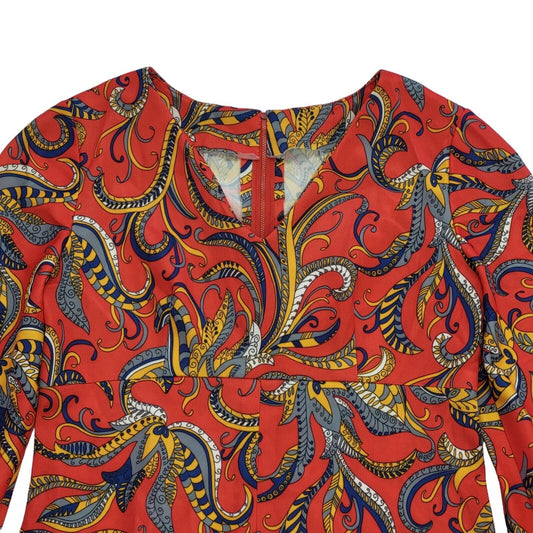 70s Vintage Red & Blue Geometric Long Sleeve Shift Dress Women's Size 14