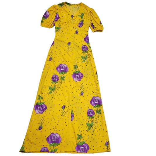 70s Vintage Yellow Purple Rose Short Sleeve A-Line Maxi Dress Women's Size 8