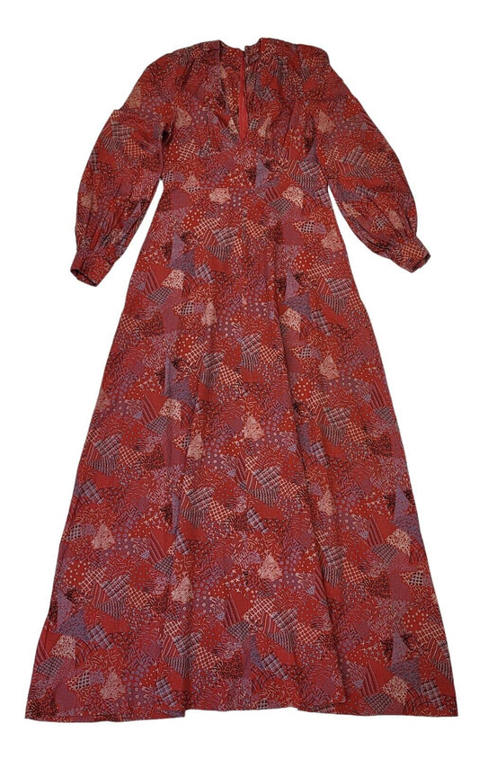 70s Vintage Red Patterned Cuffed Sleeve A-Line Maxi Dress Women's 12