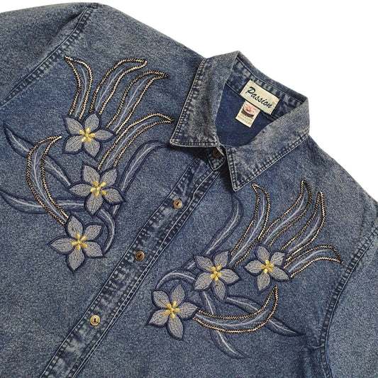 Passion Vintage 90's Blue Denim Floral Short Sleeve Shirt Womens UK Size M
