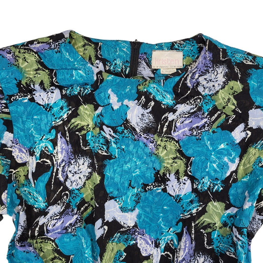 80s Vintage Kristen Blue Floral Fit & Flare Belted Daywear Dress Women's 10