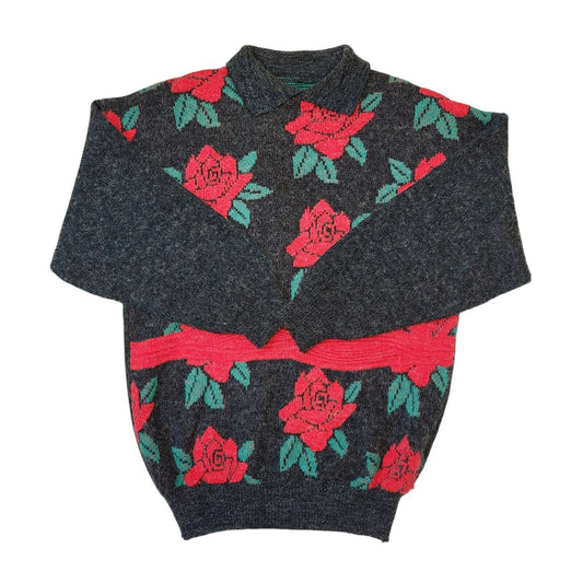 80s Vintage Grey, Red & Green Collared Floral Jumper Women's Size 16 Eu 44