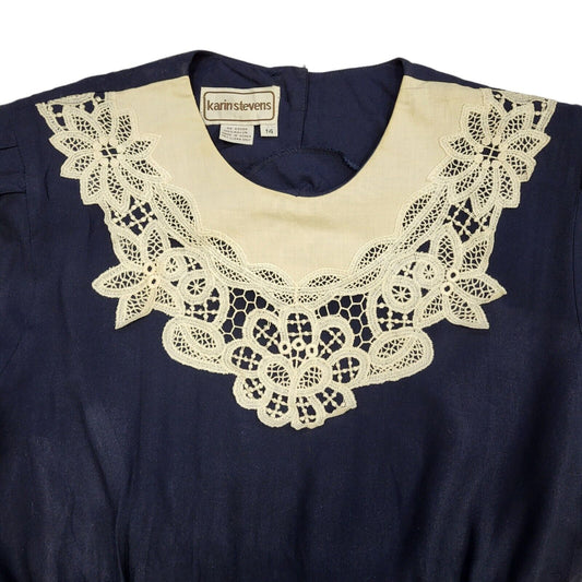 80s Vintage Karin Stevens Navy Lace Trim Dress Women's Size M