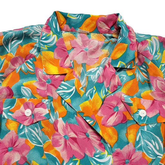 80s Vintage Pink Green Wrap Top Floral Daywear Pleat Dress Women's Size 14