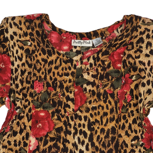 80s Vintage Pretty Pink Brown Leopard Print Fit & Flare Daywear Dress Women's L