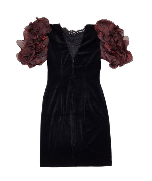 80s Vintage Yvonne Jacovous Black Plum Ruffle Velvet Evening Dress Women's 12