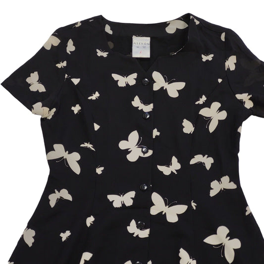 90s Vintage Alexon Black Butterflies Buttoned Daywear Dress Women's Size 12