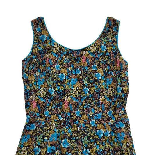 Vintage 80s Green & Blue Floral Sleeveless Daywear Dress Uk Women's Size 10