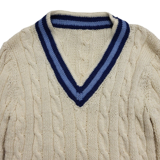 90s Vintage Cream Blue Acrylic V-Neck Cricket Jumper Uk Women's Size Small