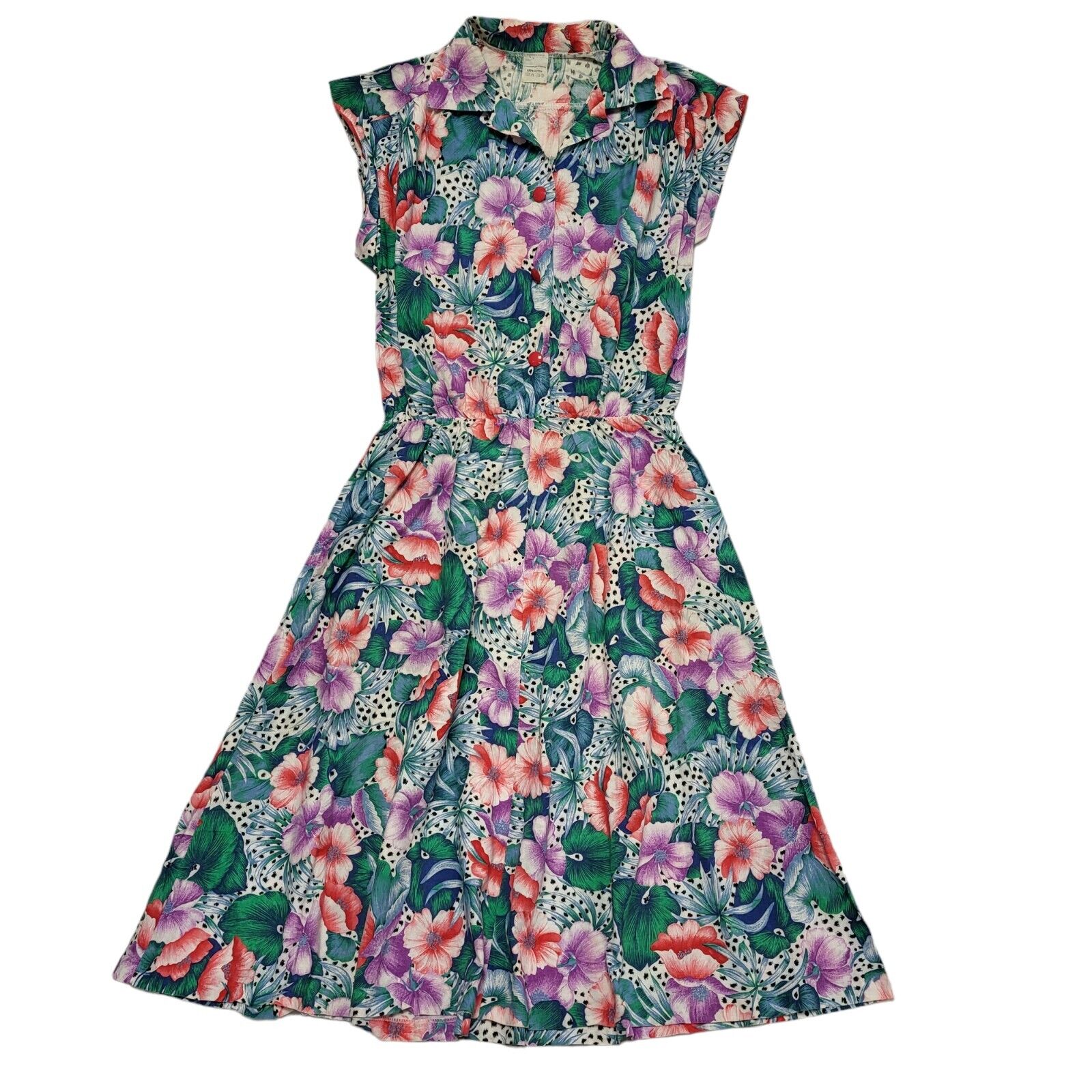 70s Vintage Green Purple Floral Fit & Flare Sleeveless A-Line Dress Women's 12