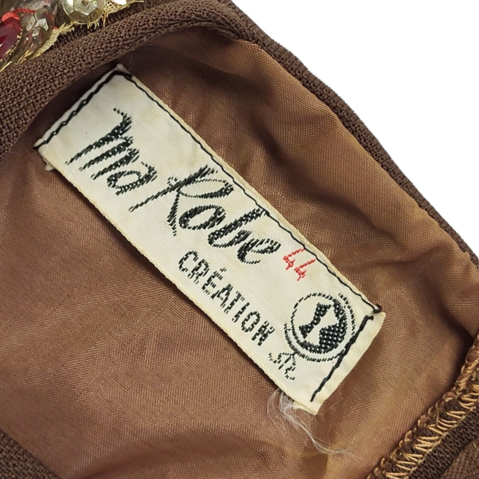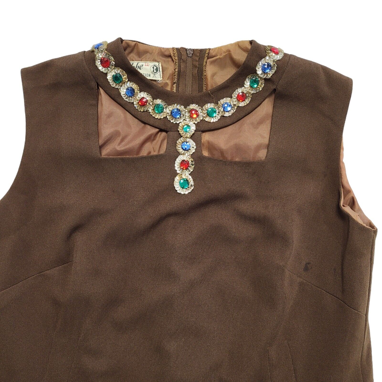 70s Vintage Ma Robe Brown Jewelled Neck Shift Dress Women's 12.