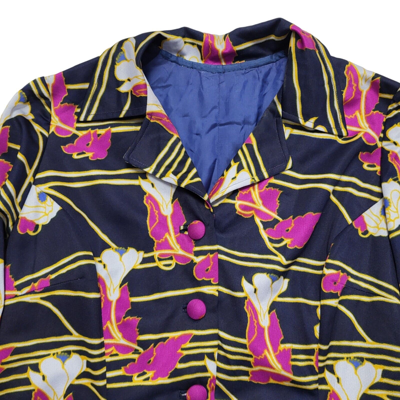 70s Vintage Navy Purple Floral Collared Long Sleeve A-Line Dress Women's 14