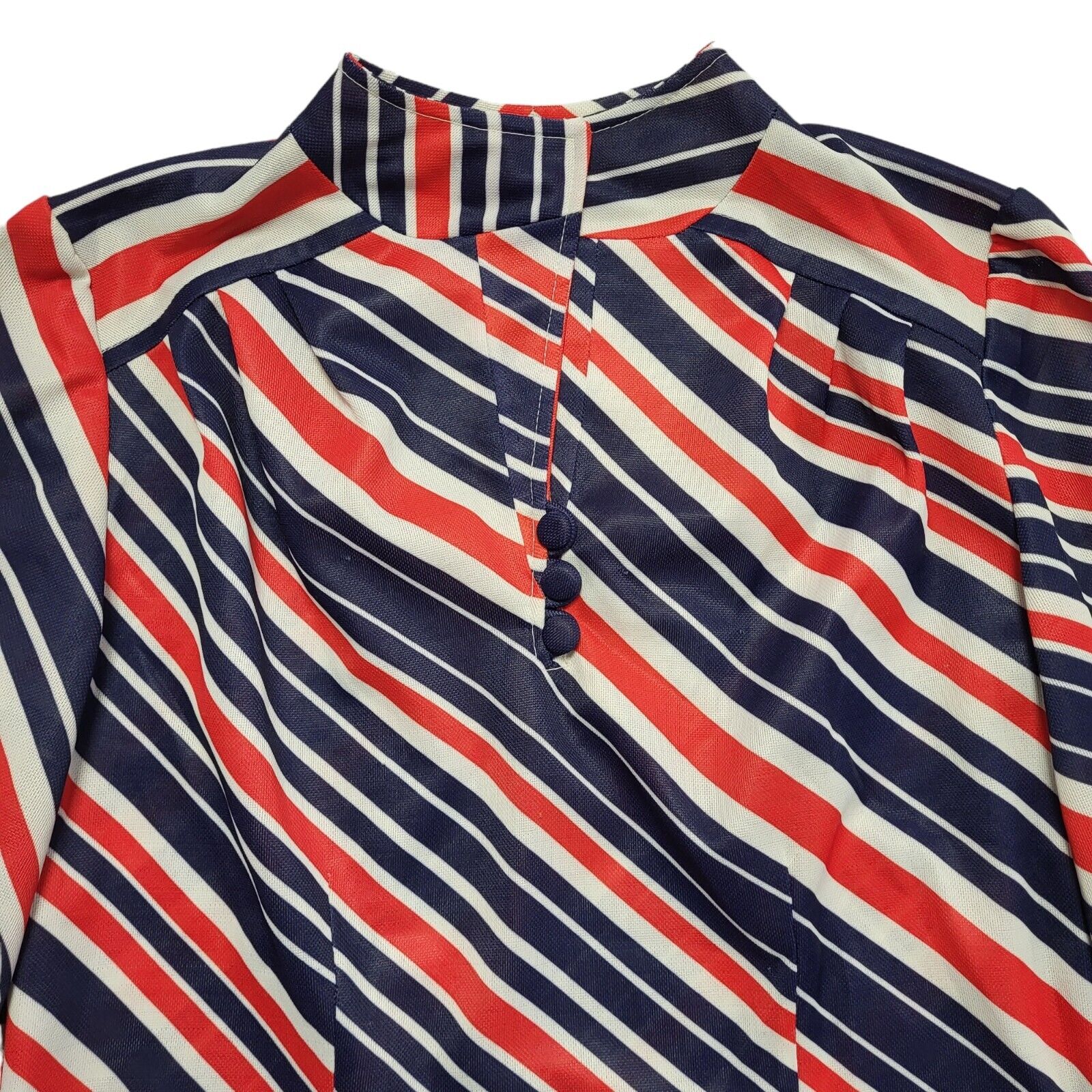 70s Vintage Red, White & Blue Striped High Neck Shift Dress Women's 14