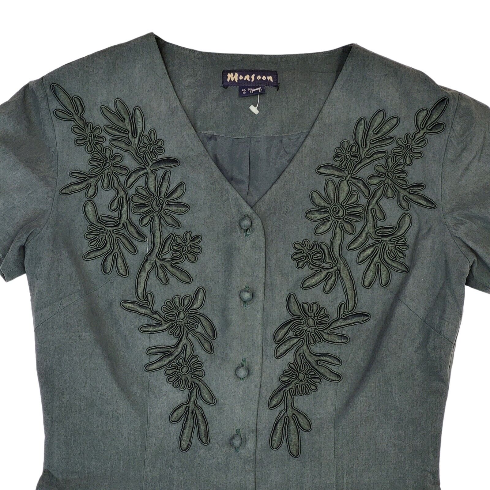90s Vintage Monsoon Dark Green Silk Buttoned Daywear Dress Women's Size 10.