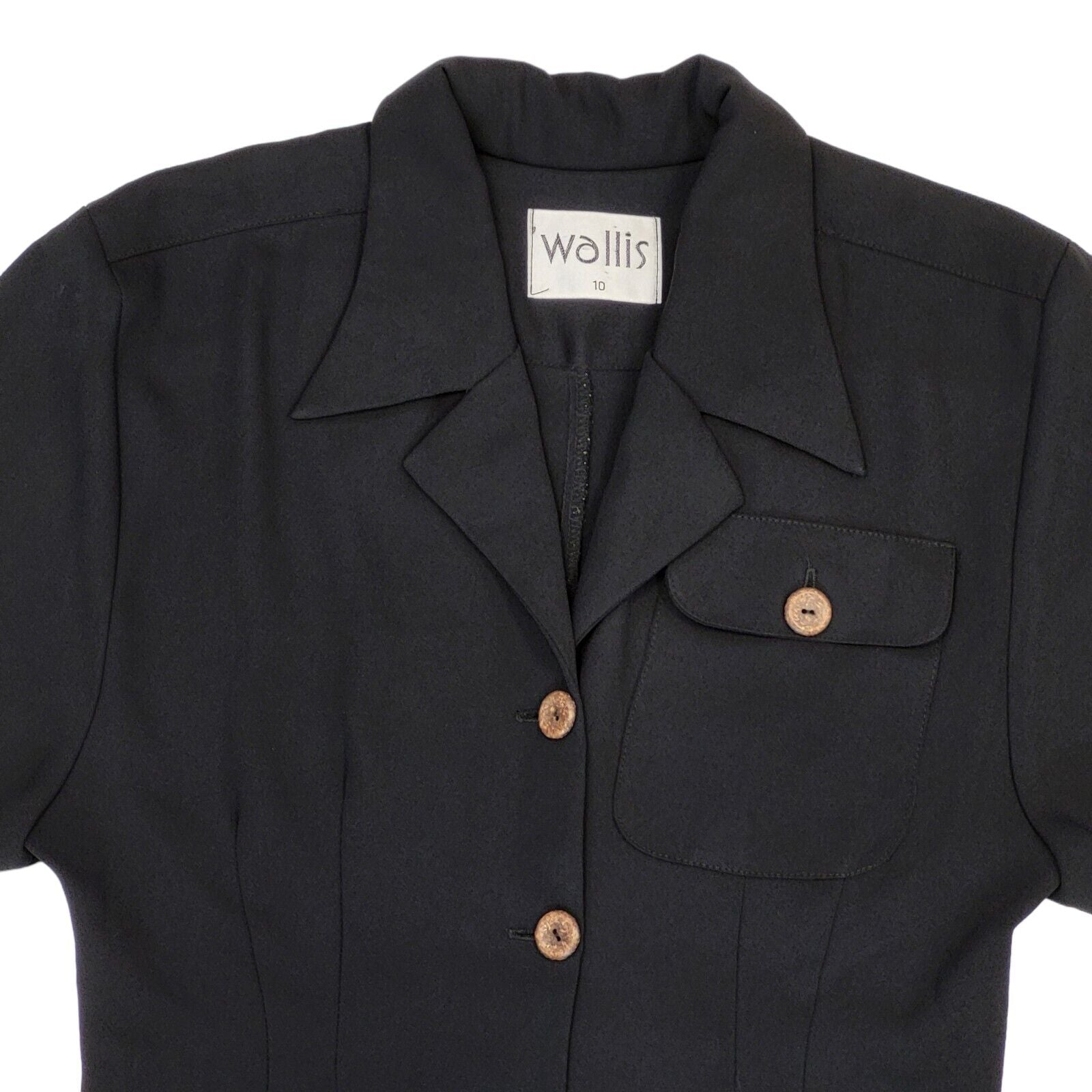 90s Vintage Wallis Black Buttoned Collared Short Sleeve Daywear Dress Women's Size 10.