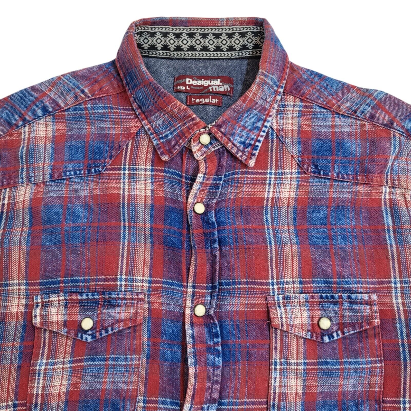 Desigual Y2k Red & Blue Check Pearl Snap Long Sleeve Shirt Uk Men's Size Large