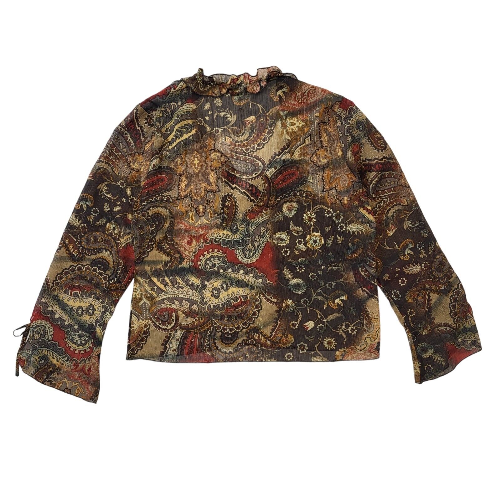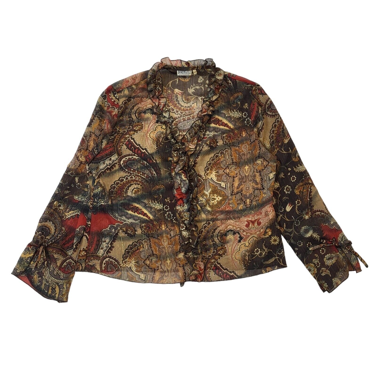 90s Vintage Brown Patterned Sheer Button Up Ruffle Blouse Womens Size XL.