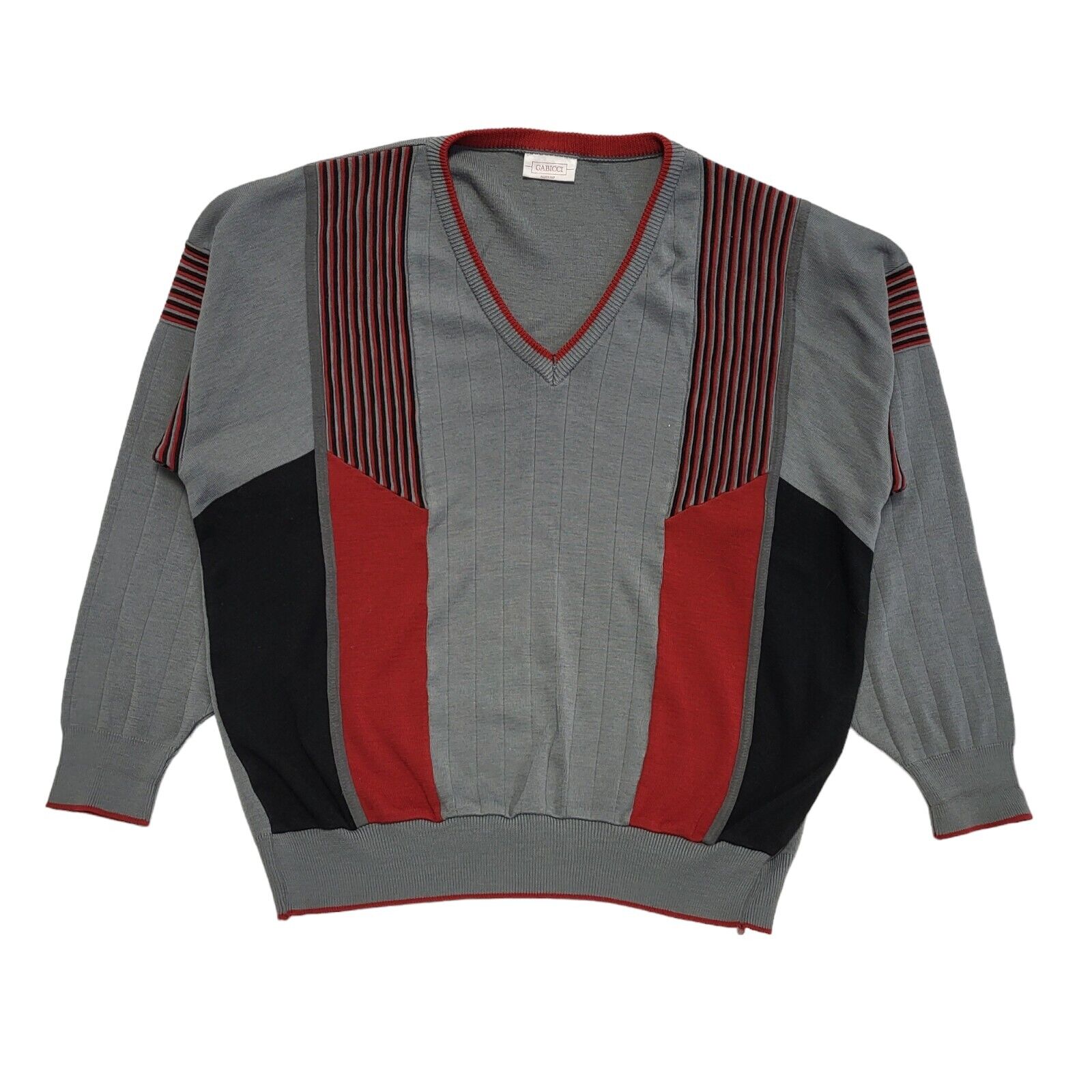 Gabicci Vintage 80s Grey Red Striped V-Neck Jumper Men's UK 2XL