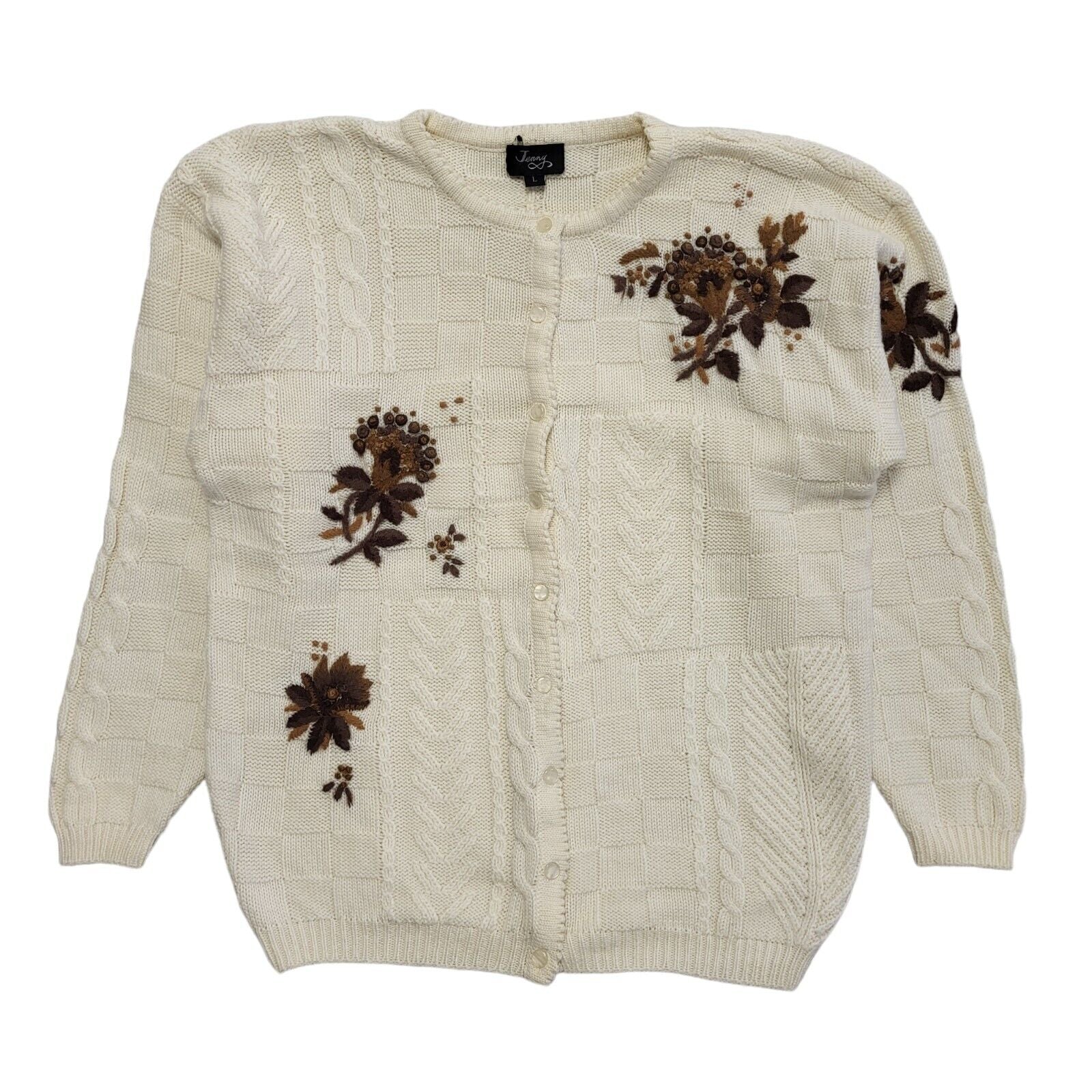Jenny 80s Vintage Cream & Brown Button Cardigan Uk Women's Size Large