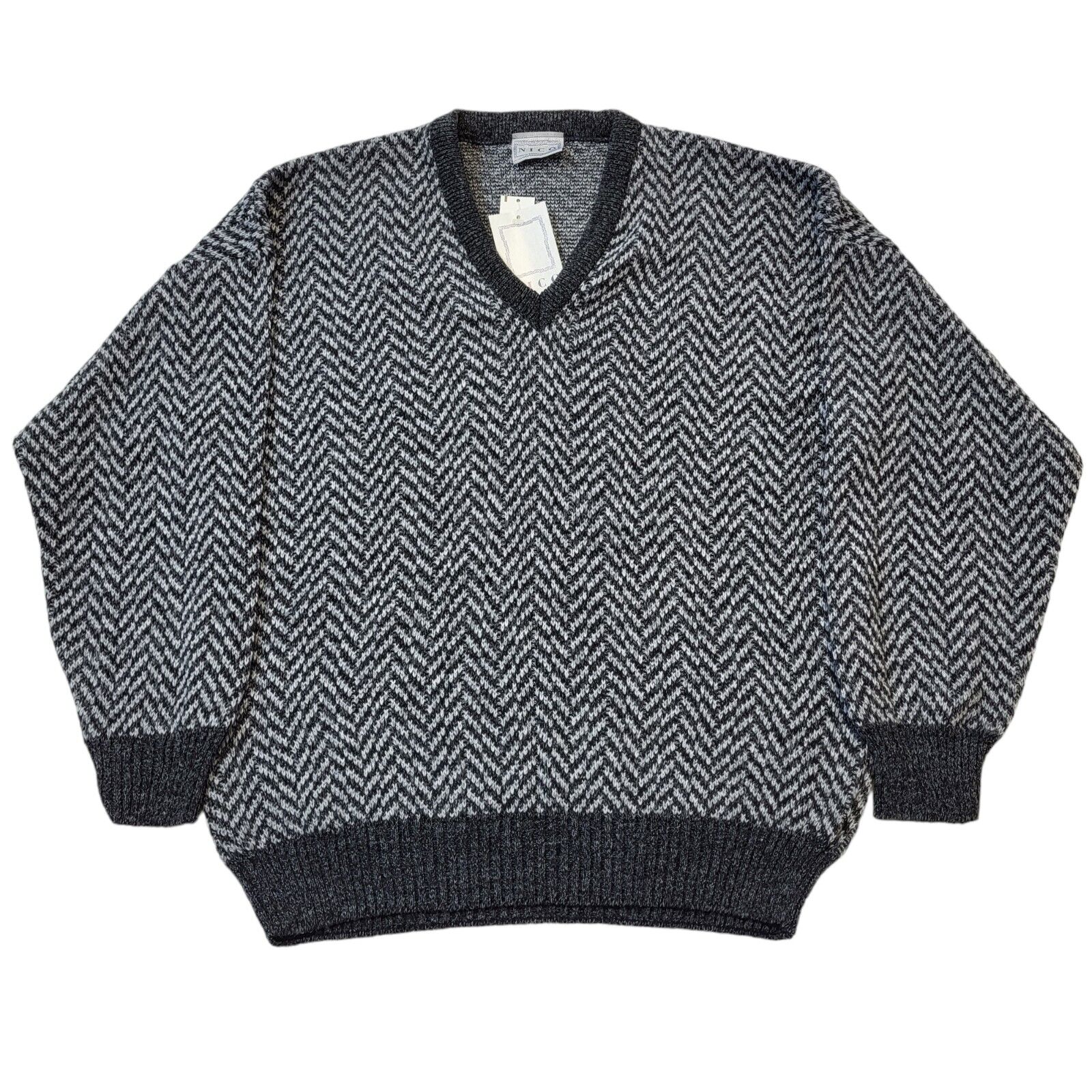 Nico 90s Vintage Grey Herringbone V-Neck Acrylic Sweatshirt Mens Size Large BNWT.