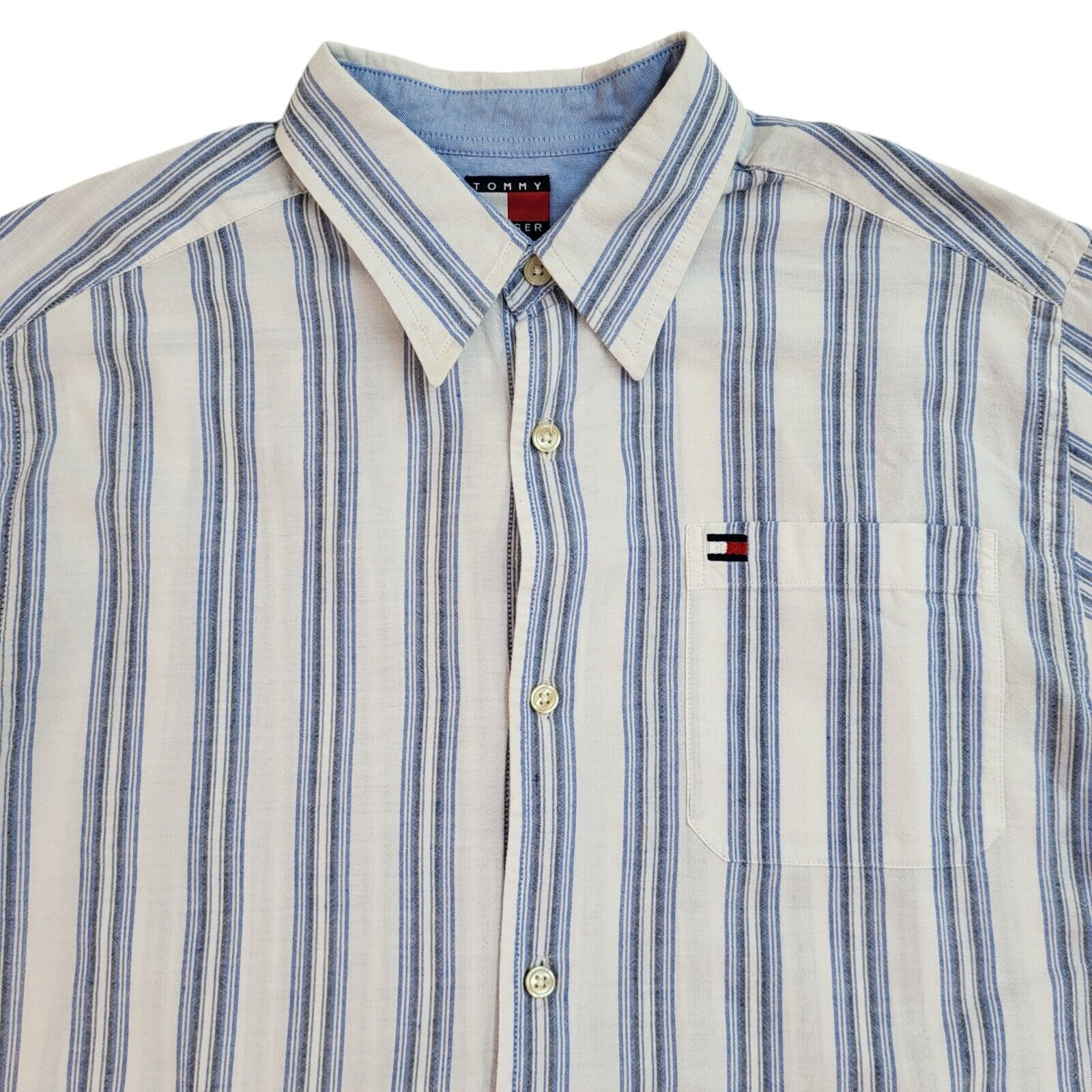 Tommy Hilfiger 90's White & Blue Striped Short Sleeve Shirt Uk Boy's Size L