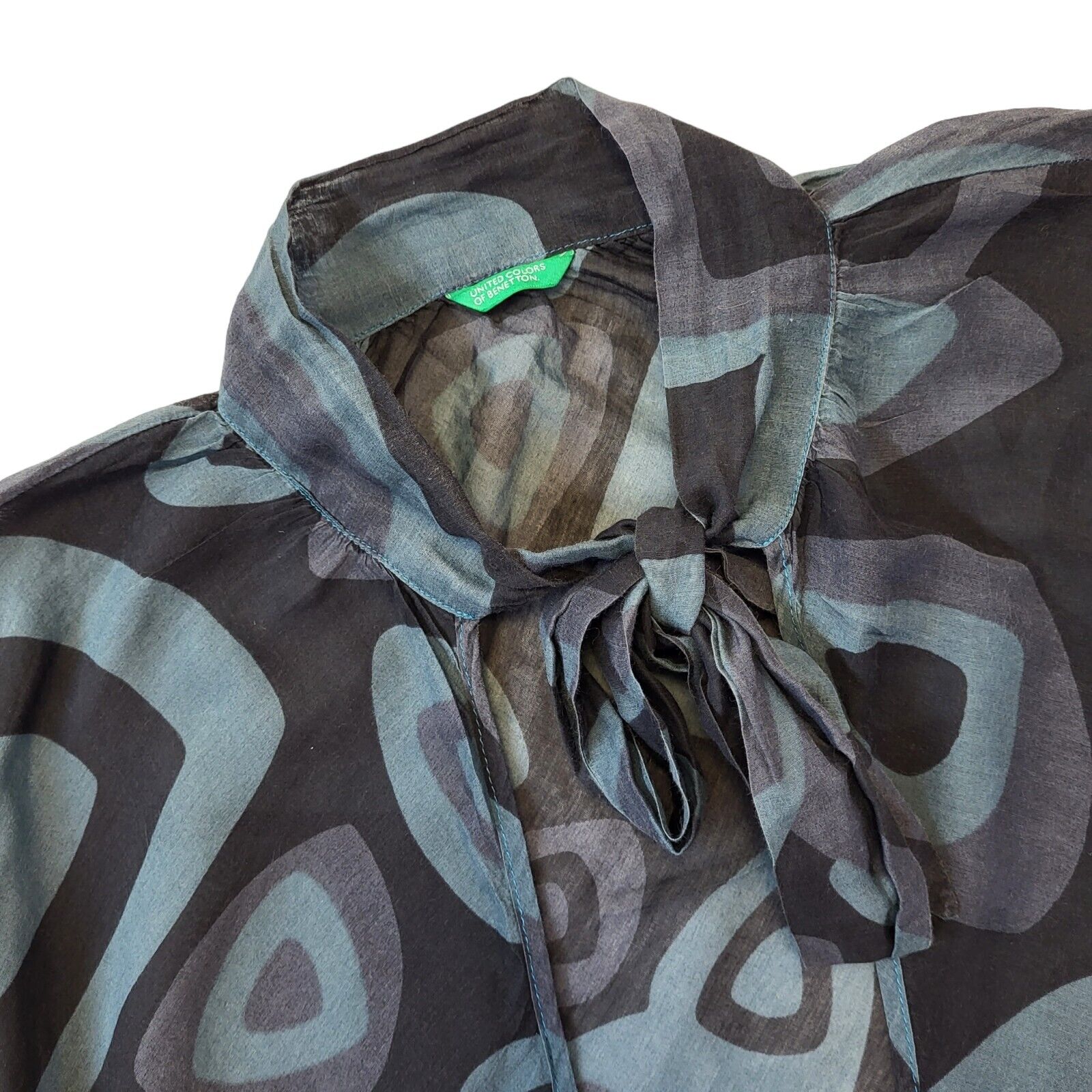 United Colors Of Benetton Y2K Black & Blue Retro Blouse With A Neck Tie Women’s Size 18.