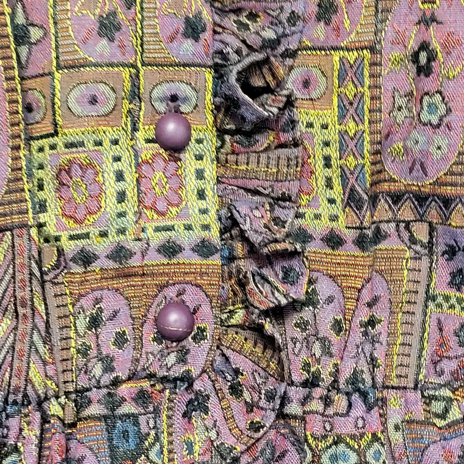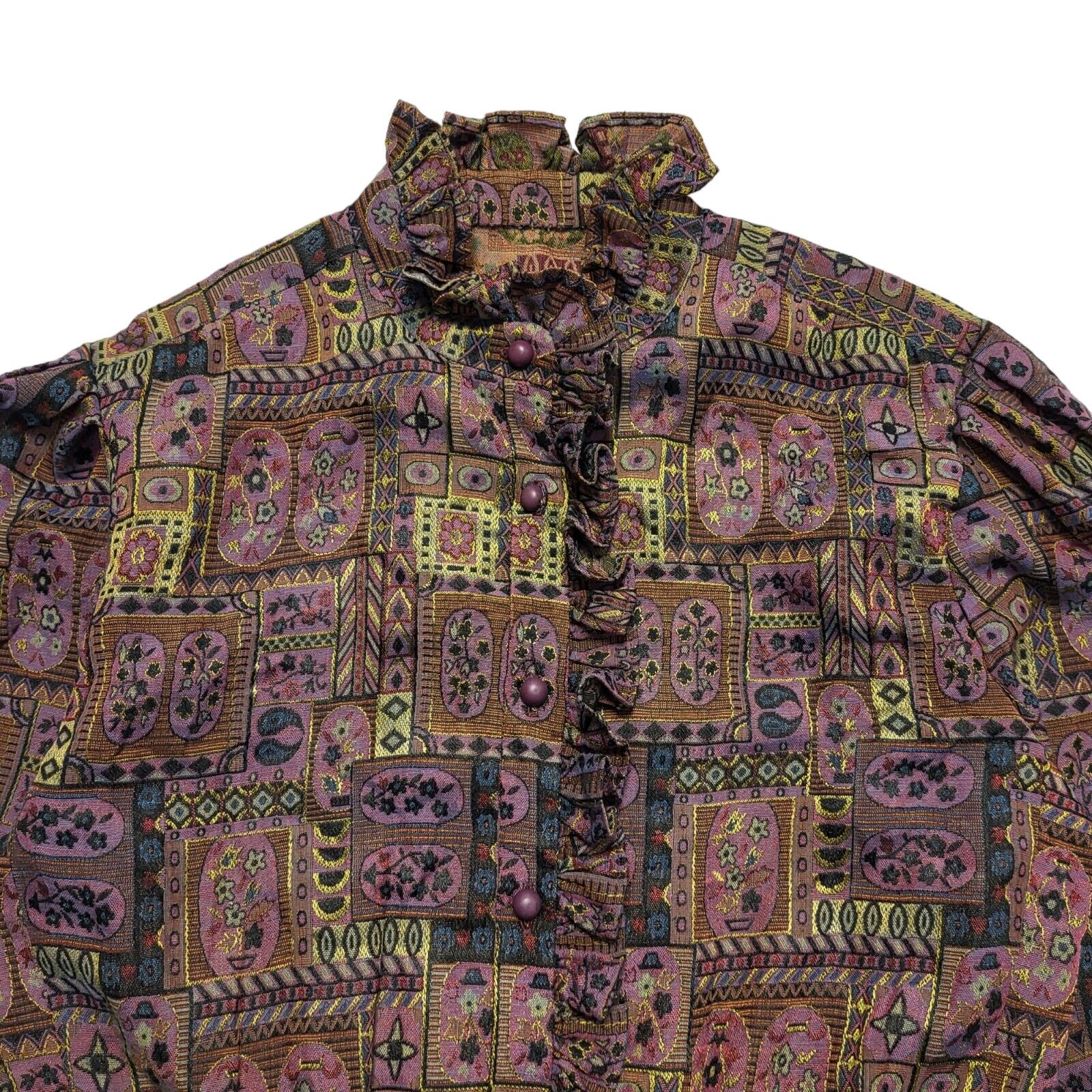 Vintage 70's Purple Gold Patterned Ruffled Trim Long Sleeve Dress Womens UK M 10