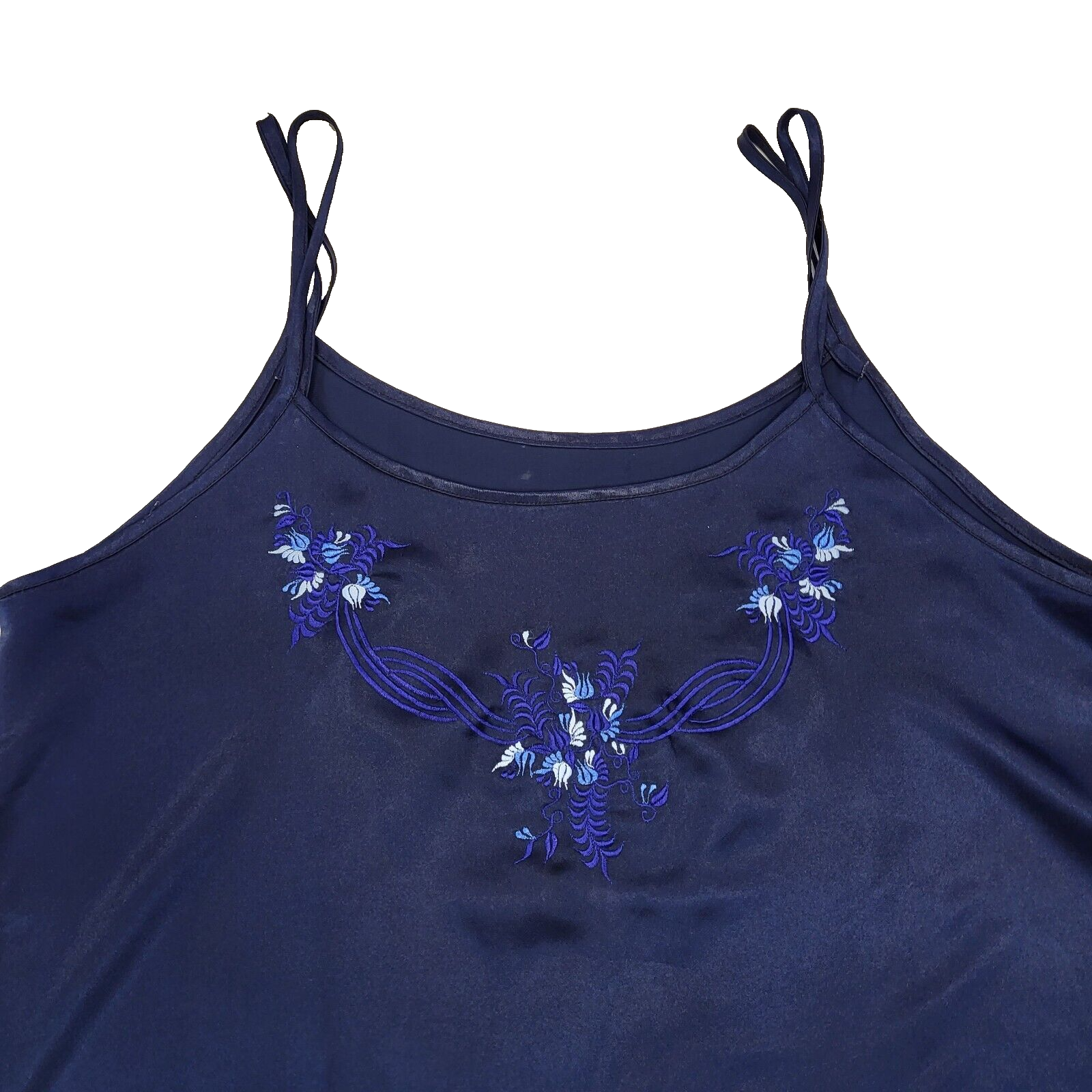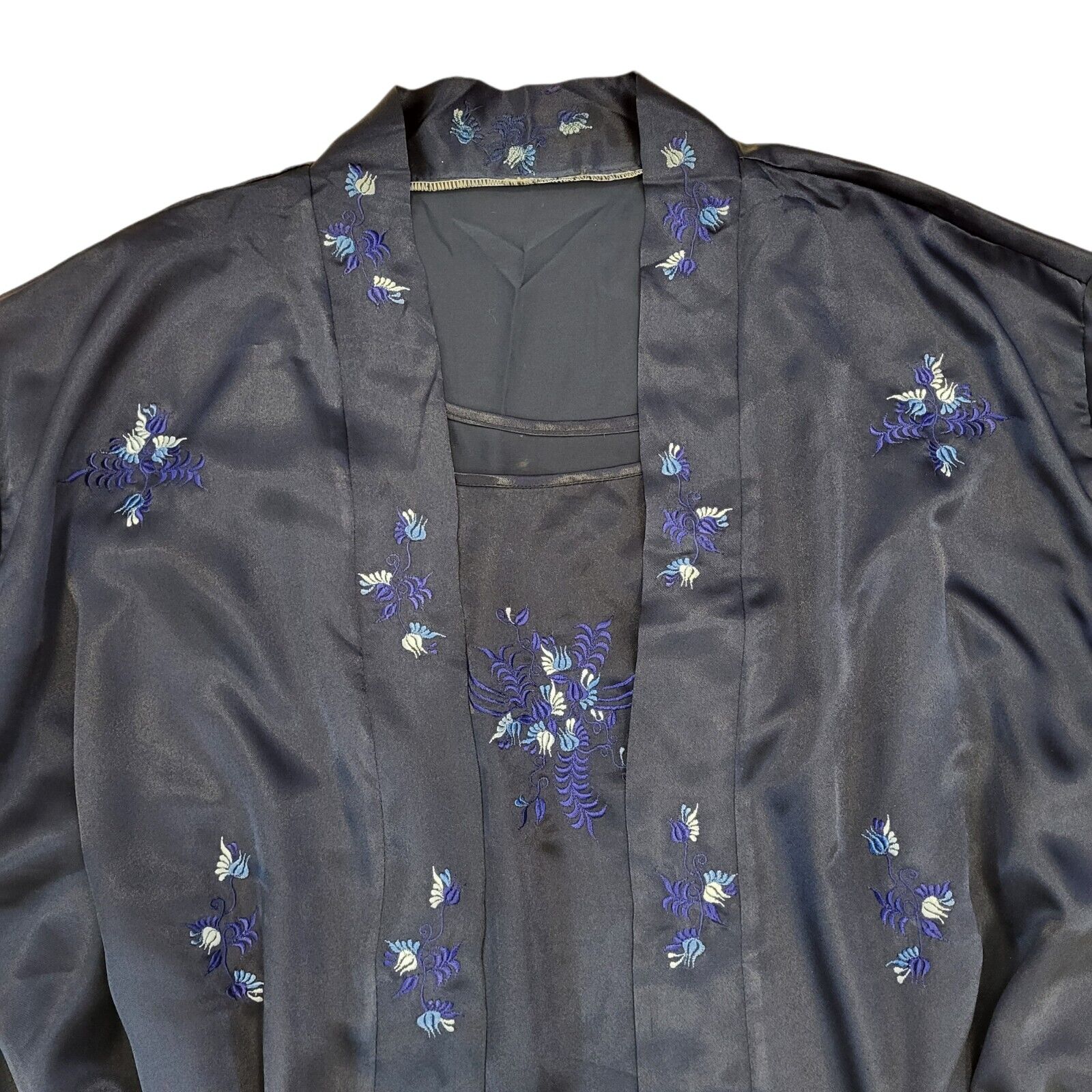 Vintage Navy Blue Floral Satin Dressing Gown & Matching Slip Dress Womens UK 14.